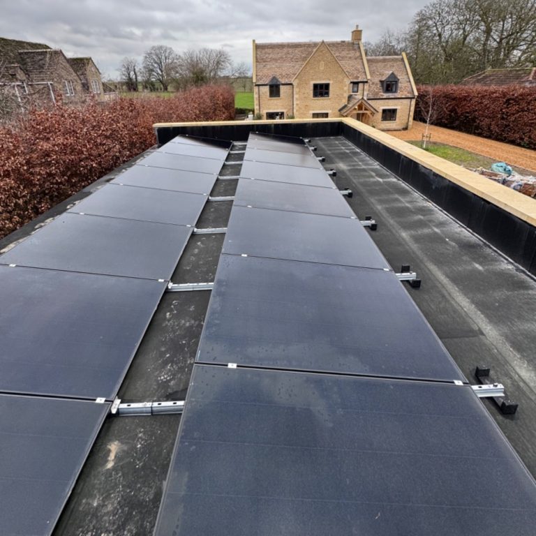 This premium solar panel installation in Wiltshire features 16 AIKO 475W high-performance panels, securely mounted on a ValkPV (Van der Valk) flat roof mounting system for durability, optimal positioning, and a clean finish.
